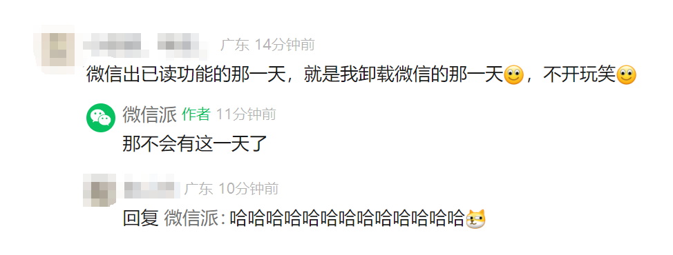 评论区也有网友说,“微信出已读功能的那一天,就是我卸载微信的那一天,不开玩笑”。微信派回复:那不会有这一天了。