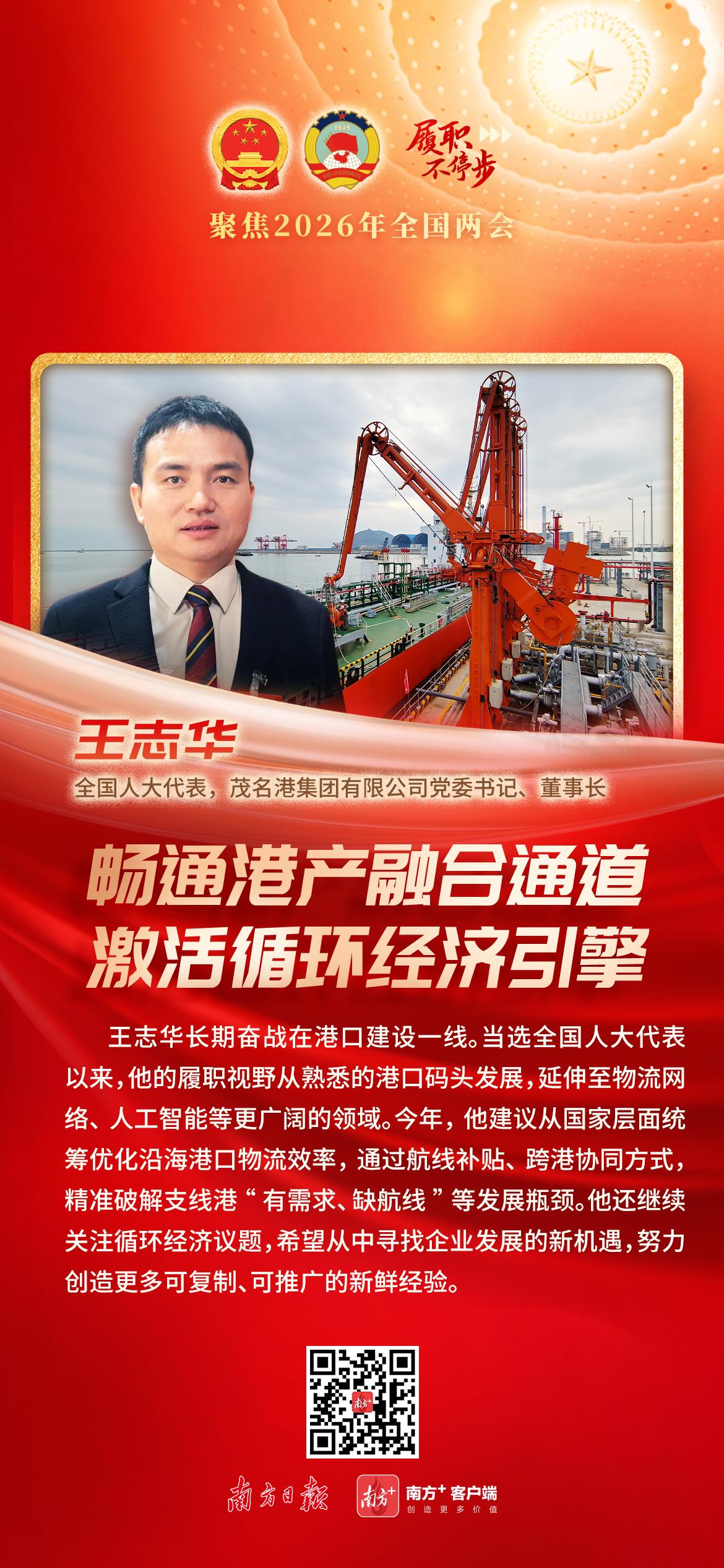 自2006年走出大学校园后,茂名港集团有限公司党委书记、董事长王志华长期奋战在港口建设第一线。当选全国人大代表以来,他的履职视野从熟悉的港口码头发展,延伸至循环经济、物流网络、人工智能等更广阔的领域。“代表履职要心往下沉、脚往下走、力向下使,既要心中有目标、脚下有泥土,更要肩上有责任、心中有全局。”他说。