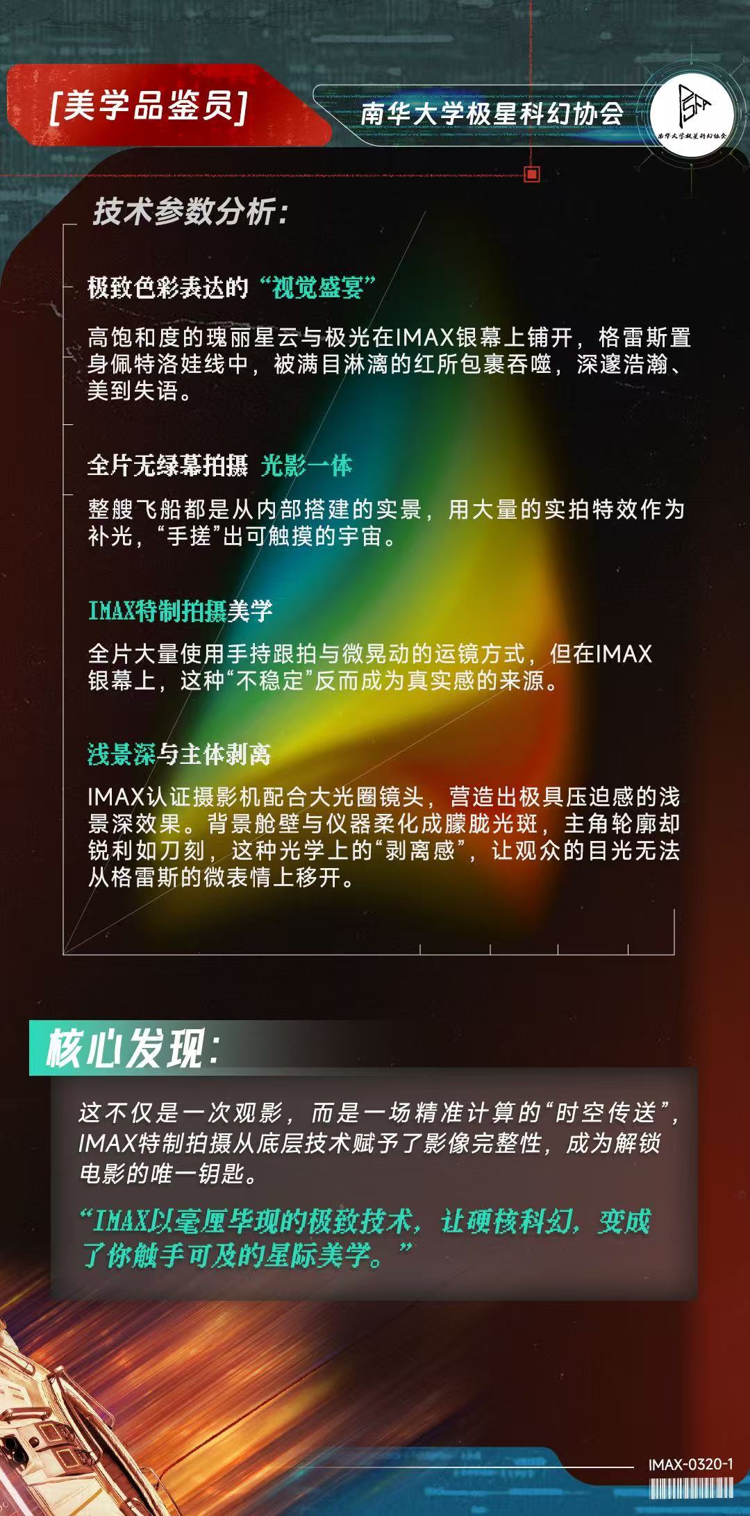 近日,IMAX联合高校科幻平台,与北京大学学生科幻协会、哈尔滨工业大学思飞科幻社、郑州大学科协科幻部、山东大学学生科幻协会、南华大学极星科幻协会、西安交通大学科幻协会等六所高校科幻社团,共同完成了一份关于IMAX特制拍摄的深度观测报告。这群年轻科幻迷化身“研究员”,从画幅、细节、声波、情感、美学、沉浸感六个维度,记录下156分钟的沉浸体验。