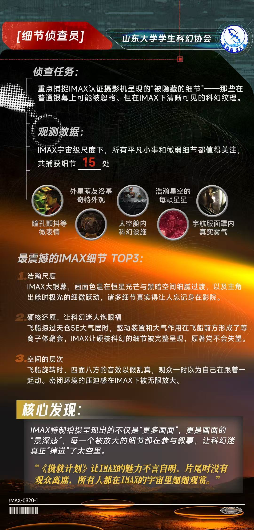 从外星萌友洛基的瞳孔颤抖,到宇航服面罩内真实雾气,山东大学学生科幻协会在IMAX银幕下捕获了15处被普通银幕可能忽略的细节。“每一个被放大的细节都在参与叙事,让科幻迷真正‘掉进’了太空里。”