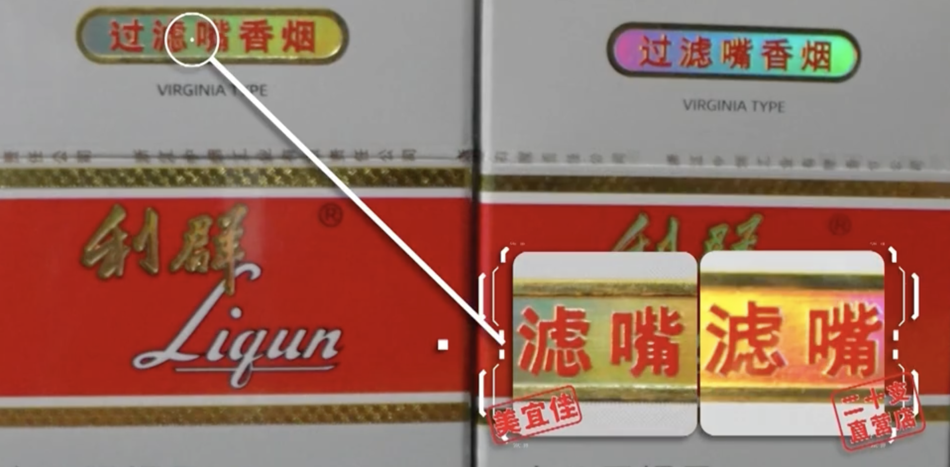 但经过仔细对比,细节差异逐渐显现。记者将这些卷烟与中国烟草直营店购买的正品卷烟进行对照发现,在一些包装细节上存在明显差别。例如,利群外包装正面的“过滤嘴香烟”的字体与正版卷烟在印刷上有明显不同,煊赫门烟盒左上角图案中间的方块位置也存在居中和粘连的差别。