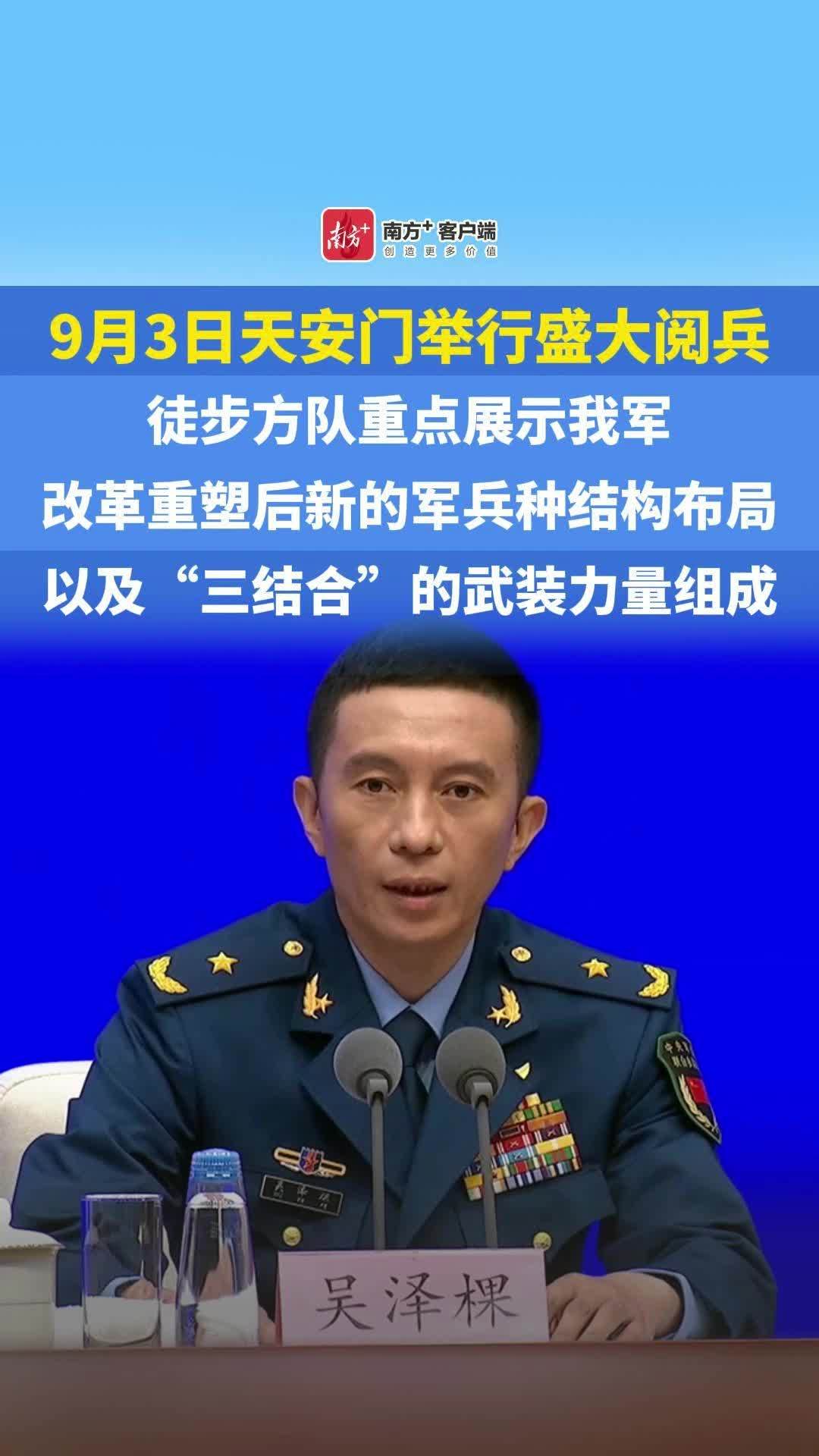 发布会介绍,今年9月3日在首都天安门举行盛大阅兵式,这次阅兵由徒步方队、装备方队和空中梯队组成,在总体设计上能科学安排解放军和武警部队力量参阅,精心编组各受阅的装备梯队。