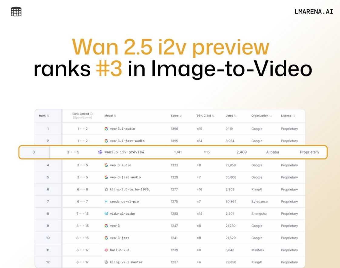 据介绍,阿里万相2.5是目前业界少数具备音画同步能力的视频模型之一,该模型同时支持理解和生成等多种任务,支持文本、图像、视频、音频多种模态的输入和输出,在权威大模型评测LMArena上,万相的图生视频能力位居全球第三,稳居国内第一。