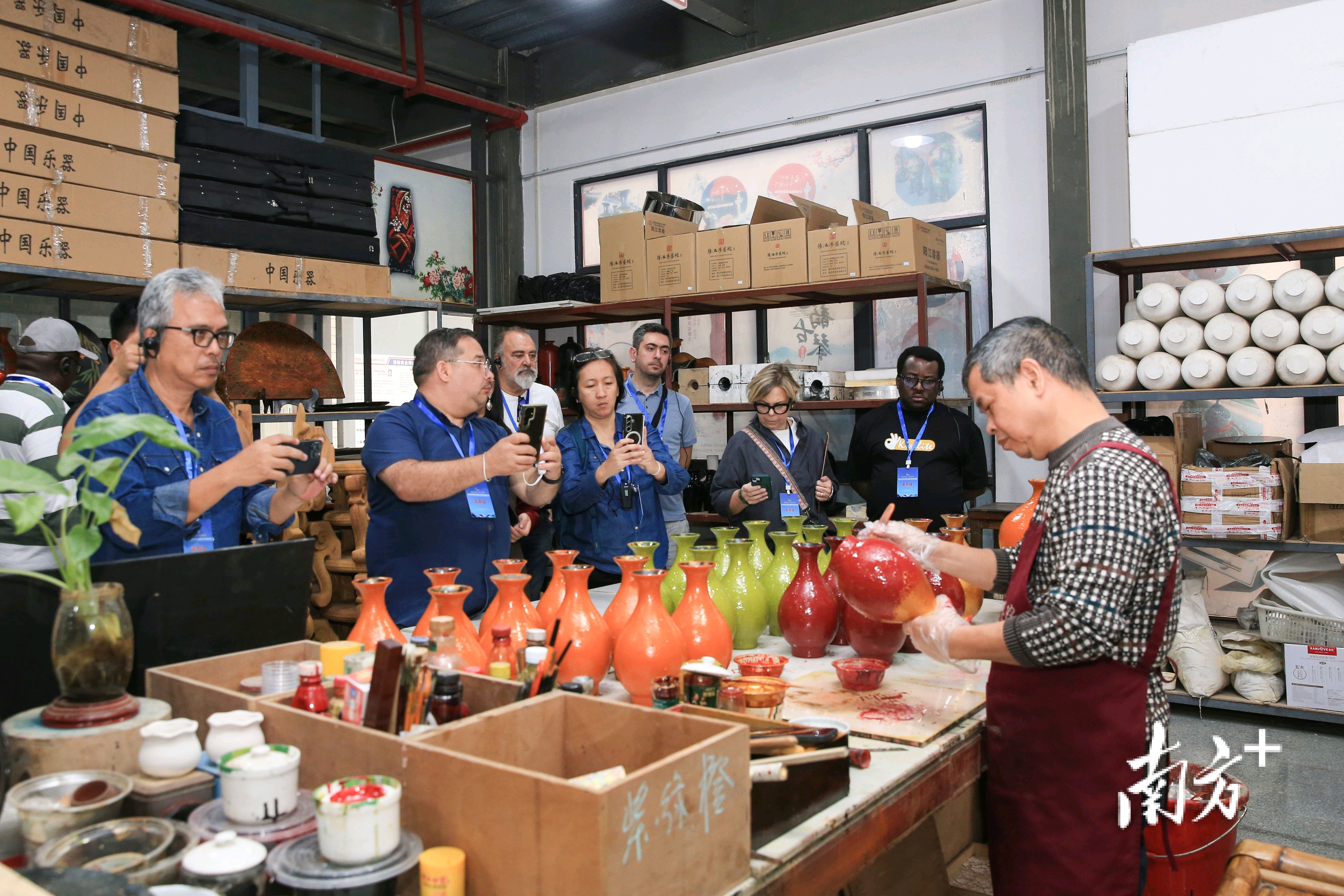 院内设有博物馆、工作室与体验坊,外宾们近距离观赏绚丽多彩、造型奇巧的漆器,聆听关于阳江漆艺历史脉络与技艺特点的讲解,感受这项千年非遗在当代的传承与创新。