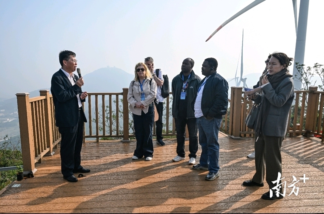 12月6日上午,探访团登上海陵岛天麓山顶公园。这里运行着十余台陆地风力发电机,山顶观景平台可俯瞰闸坡国家级中心渔港全景与海上风电阵列,风车、云海与海湾交织成壮丽画卷。