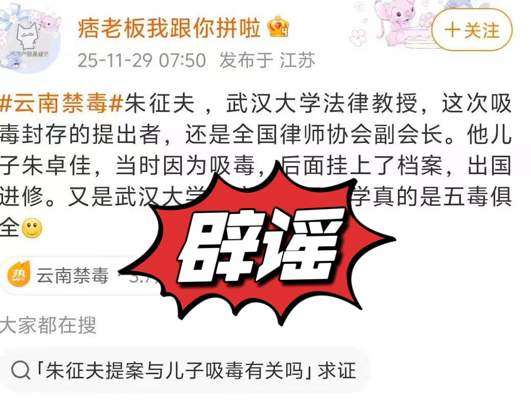 大量网传消息称:“武大法学教授朱征夫,其子朱卓拉因涉嫌容留他人吸毒罪被刑事拘留”,亦有传言称其吸毒的儿子名为“朱卓佳”,还有更夸张的传言称其全家涉毒,质疑其提轻罪前科记录封存制度建议是为家人考虑。