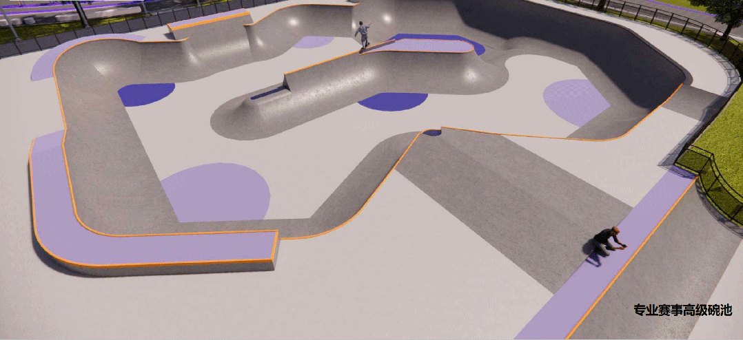 街式区则充满了台阶、花坛、扶手等丰富道具。根据适用人群、比赛规格的不同,分别设计了初级、中级、高级场地。