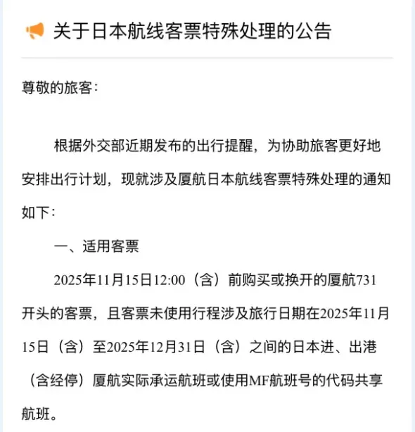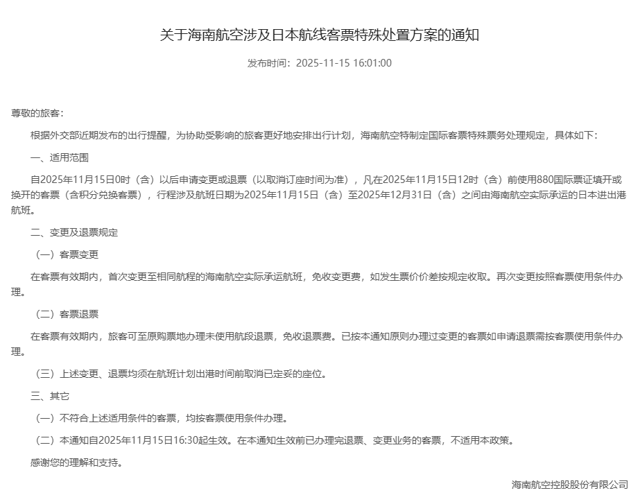 通知中明确,特殊处置方案适用范围如下:自2025年11月15日0时(含)以后申请变更或退票(以取消订座时间为准),凡在2025年11月15日12时(含)前使用880国际票证填开或换开的客票(含积分兑换客票),行程涉及航班日期为2025年11月15日(含)至2025年12月31日(含)之间由海南航空实际承运的日本进出港航班。