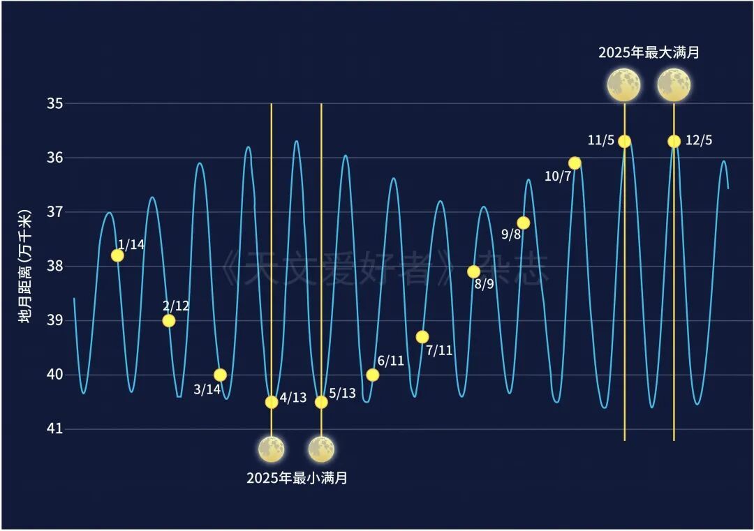 2025年最大的两次近地点满月将发生在11月5日和12月4日。这两次近地点满月的视直径几乎都达到了34角分。11月的“超级月亮”比12月的稍大一点。