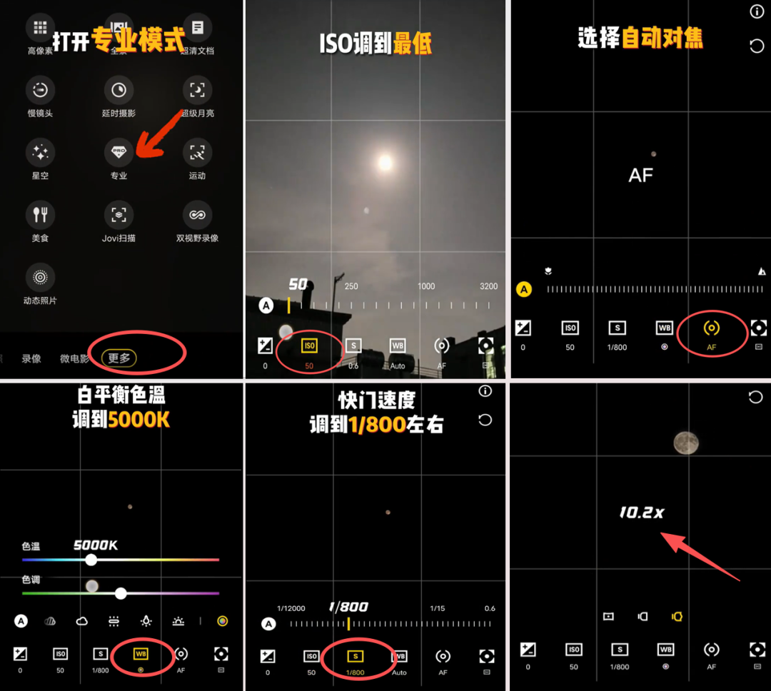 地理位置、拍摄时间、手机型号不同,以上参数仅供参考,具体数值可根据现场光线条件进行调整。如果手机自带的“超级月亮”模式,参数已智能调节好,只需放大焦段对准月亮拍摄即可。