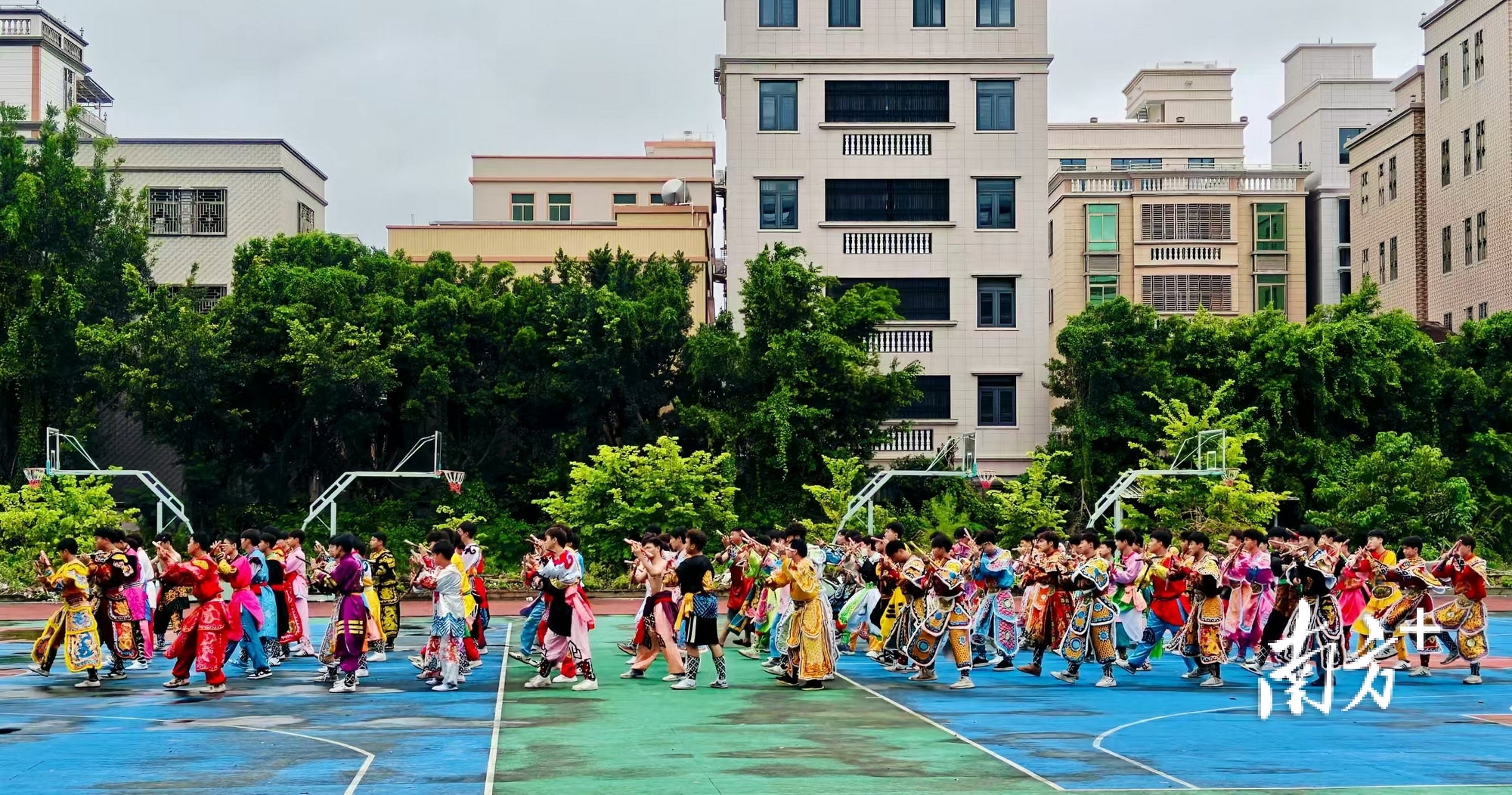 南方+记者了解到,为适应开幕式环形水舞台的表演,潮阳英歌队特别编排了更具现代美感和象征意义的阵型变化:在中心水舞台,96名英歌队员通过大梯形势如破竹地推进,继而扩散为散点八边形,寓意“聚是一团火,散是满天星”;到后面的龙舟队形,呈现一番中华民族同舟共济,乘风破浪,如海潮般磅礴汹涌、奋发向上的景象。整体队形时而聚集、时而扩散,时而推进、时而转动,形成360度环绕、平视、俯瞰等全方位观赏角度,让潮阳英歌成功地“舞台化”,赋予这项古老的非遗艺术全新的表达维度。