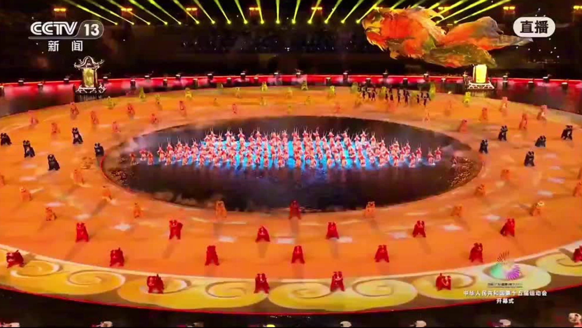 十五运会开幕式精心设计《同根同源》《同心同缘》《同梦同圆》三大篇章,巧妙融汇武术、醒狮、英歌、粤剧等岭南文化精髓,展现岭南风韵。这次近百人潮阳英歌队站在岭南文化展示环节的C位,参与第二篇章《同心同缘》之《赛龙夺锦》节目,以及最后主题歌表演。