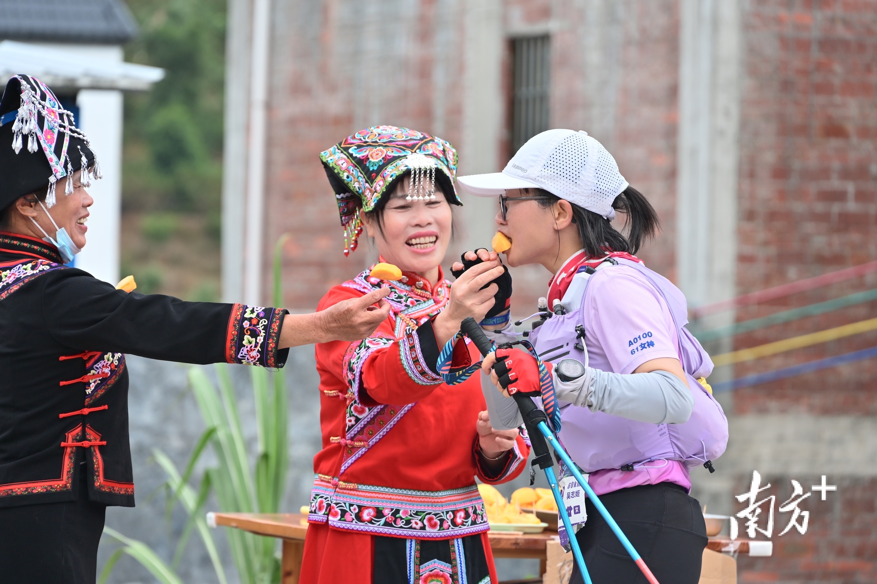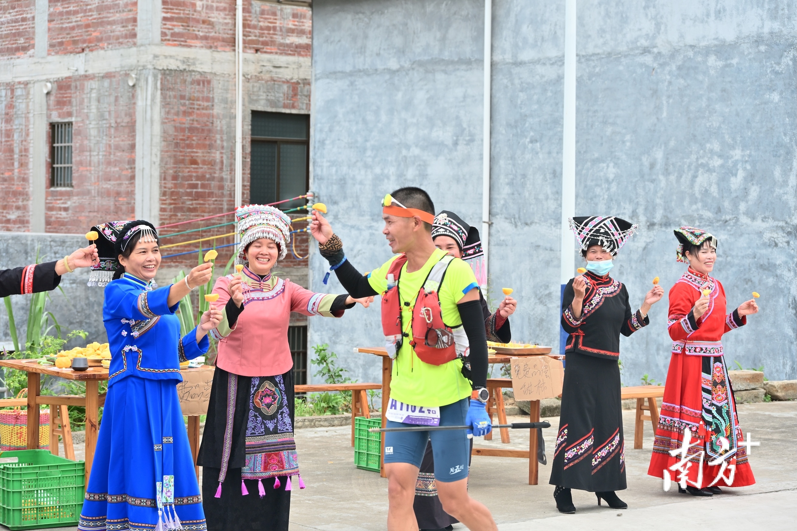 这份贯穿始终的周到服务,与赛道上的民间温暖相映生辉。在大成镇北梭村赛段,一阵欢快的民族音乐吸引了跑者的注意。身着精美云南民族服饰的庞明英、王云春等“本地媳妇”正载歌载舞,将切好的北梭甜柿递到选手手中。“吃个北梭甜柿,柿柿如意!”她们热情地招呼着每一位经过的跑者。