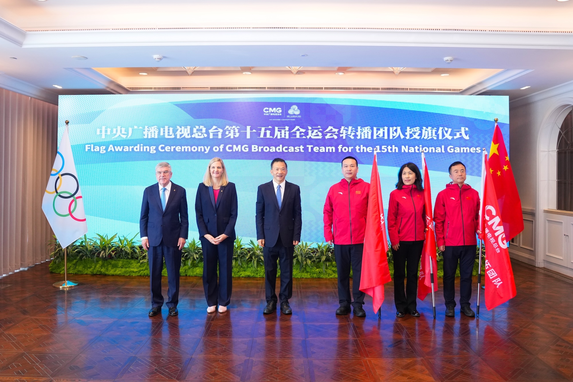 在国际奥委会主席考文垂和国际奥委会终身名誉主席巴赫的共同见证下,中宣部副部长、中央广播电视总台台长慎海雄向总台第十五届全运会转播报道团队、技术保障团队、市场开拓团队授旗。