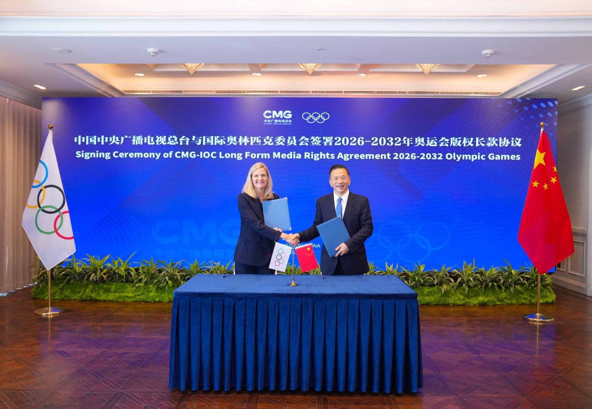 在中华人民共和国第十五届运动会开幕之际,11月9日,总台与国际奥委会在广州签署2026—2032年奥运会版权长款协议。中宣部副部长、中央广播电视总台台长慎海雄和国际奥委会主席考文垂代表双方签约,并共同发布总台2026年米兰—科尔蒂纳丹佩佐冬奥会报道标识。国际奥委会终身名誉主席巴赫出席活动。