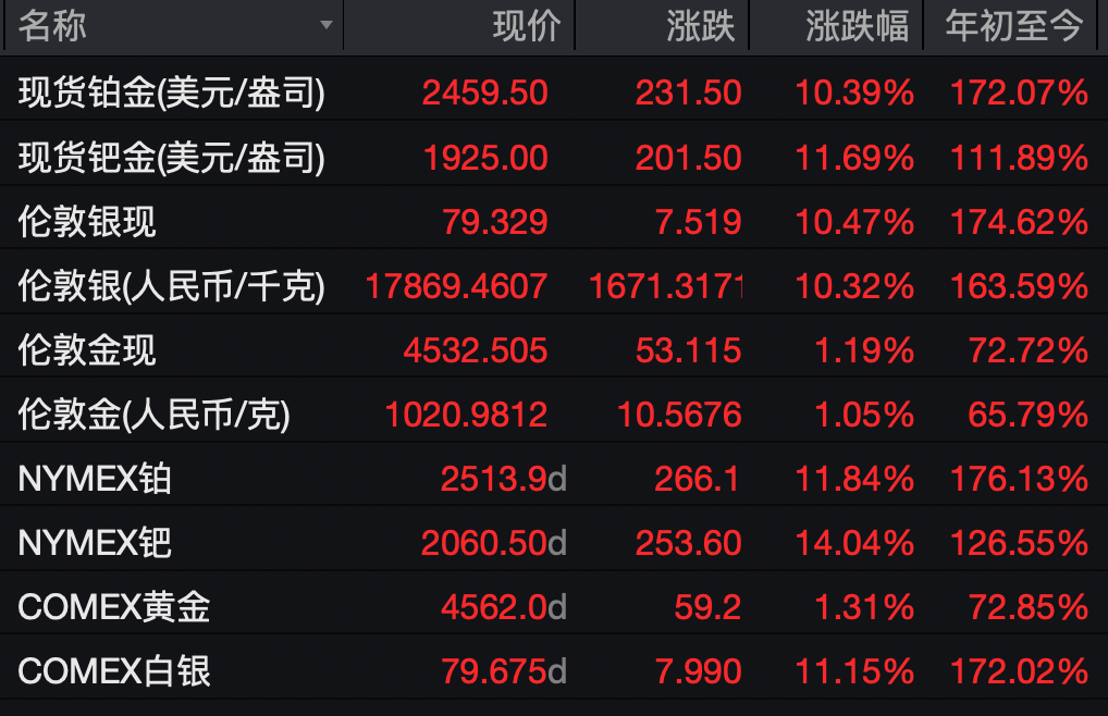COMEX黄金期货涨1.31%,报4562美元/盎司,本周累涨3.98%;现货黄金盘中一度触及4549.96美元/盎司,收盘报4532.505美元/盎司,涨1.19%。COMEX白银期货暴涨11.15%,报79.68美元/盎司;现货白银站上79美元/盎司,收盘报79.196美元/盎司。现货铂金暴涨10.31%,报2450.91美元/盎司,本周累涨24.31%。