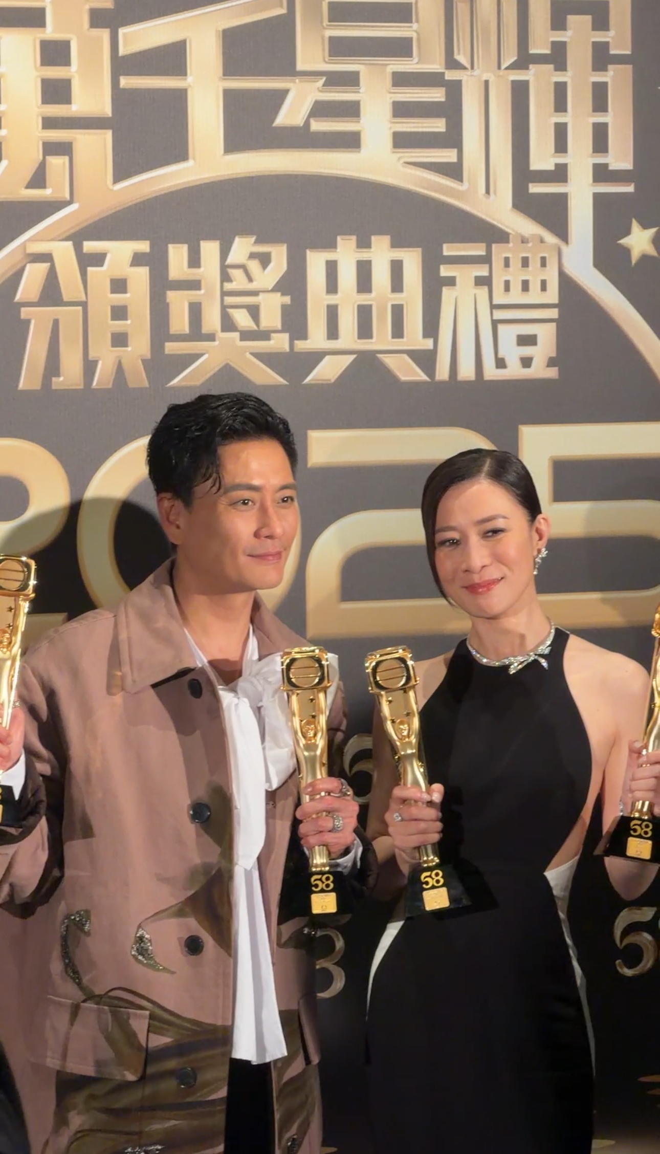 “视帝”黄宗泽与“视后”佘诗曼在后台手持奖杯合影。