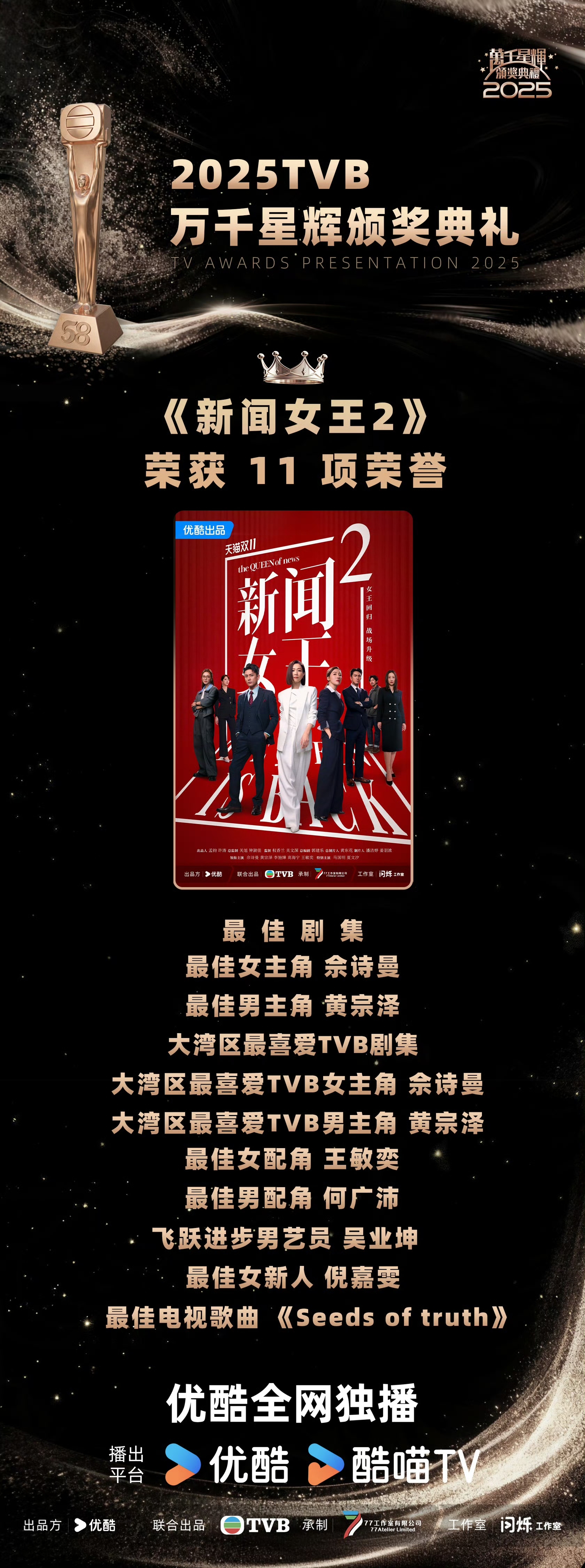 1月4日晚,TVB万千星辉颁奖典礼2025于澳门落幕。电视剧《新闻女王2》几乎横扫剧集类奖项,共拿下最佳剧集、最佳男主角、最佳女主角、最佳男配角、最佳女配角、大湾区最喜爱TVB剧集、大湾区最喜爱TVB男主角、大湾区最喜爱TVB女主角、飞跃进步男艺员、最佳女新人,最佳电视歌曲11项大奖,再现爆款实力。