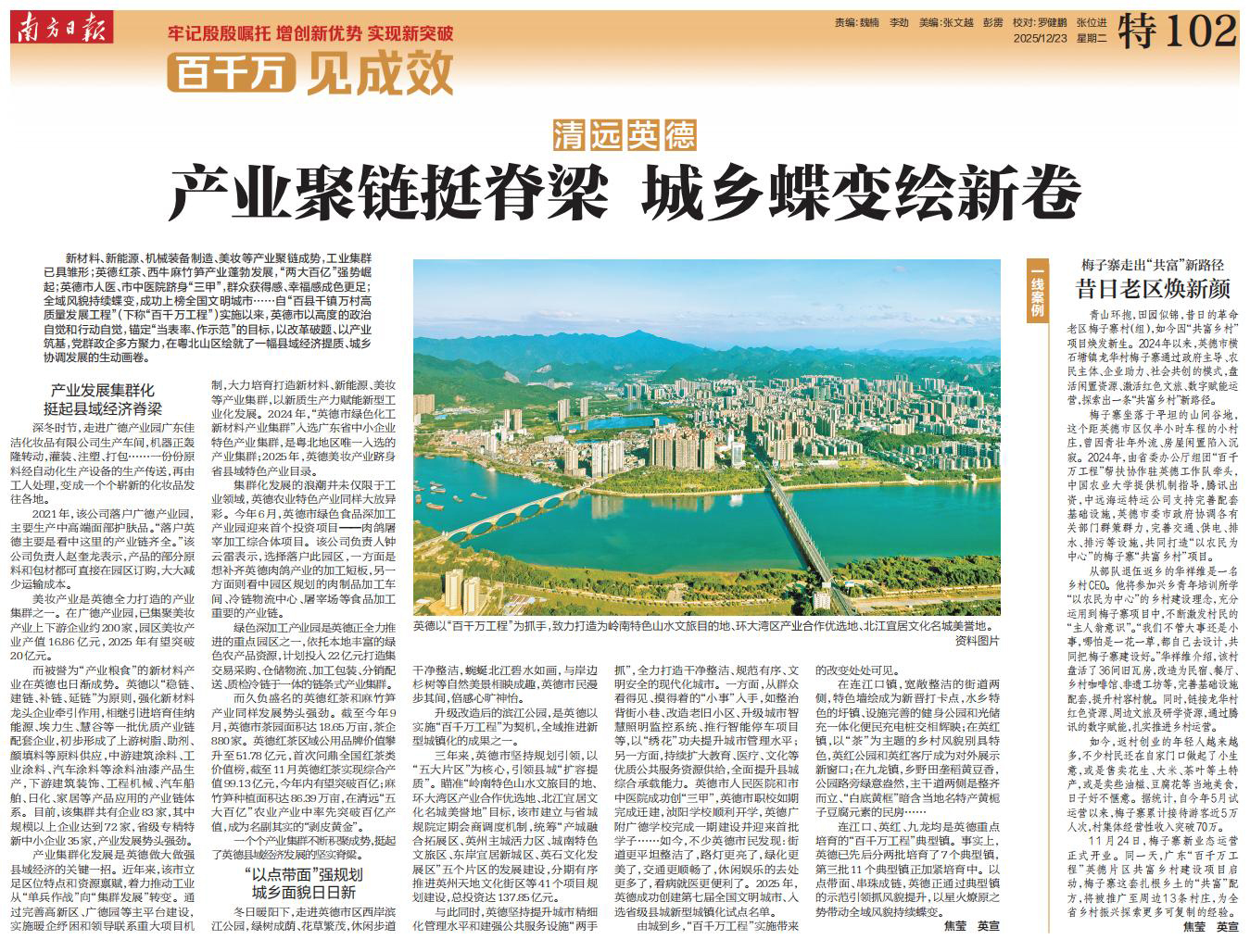 新材料、新能源、机械装备制造、美妆等产业聚链成势,工业集群已具雏形;英德红茶、西牛麻竹笋产业蓬勃发展,“两大百亿”强势崛起;英德市人医、市中医院跻身“三甲”,群众获得感、幸福感成色更足;全域风貌持续蝶变,成功上榜全国文明城市……自“百县千镇万村高质量发展工程”(下称“百千万工程”)实施以来,英德市以高度的政治自觉和行动自觉,锚定“当表率、作示范”的目标,以改革破题、以产业筑基,党群政企多方聚力,在粤北山区绘就了一幅县域经济提质、城乡协调发展的生动画卷。