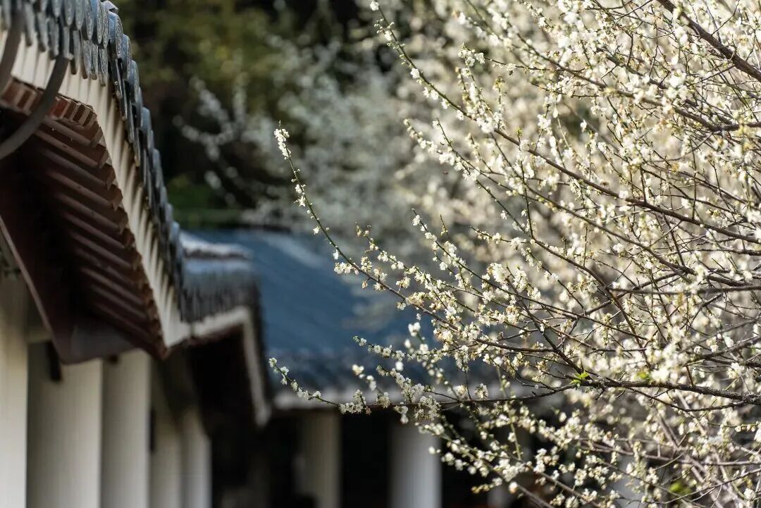 长廊依山而建,梅树与蓝瓦白墙的传统建筑交错生长,适合漫步观赏。