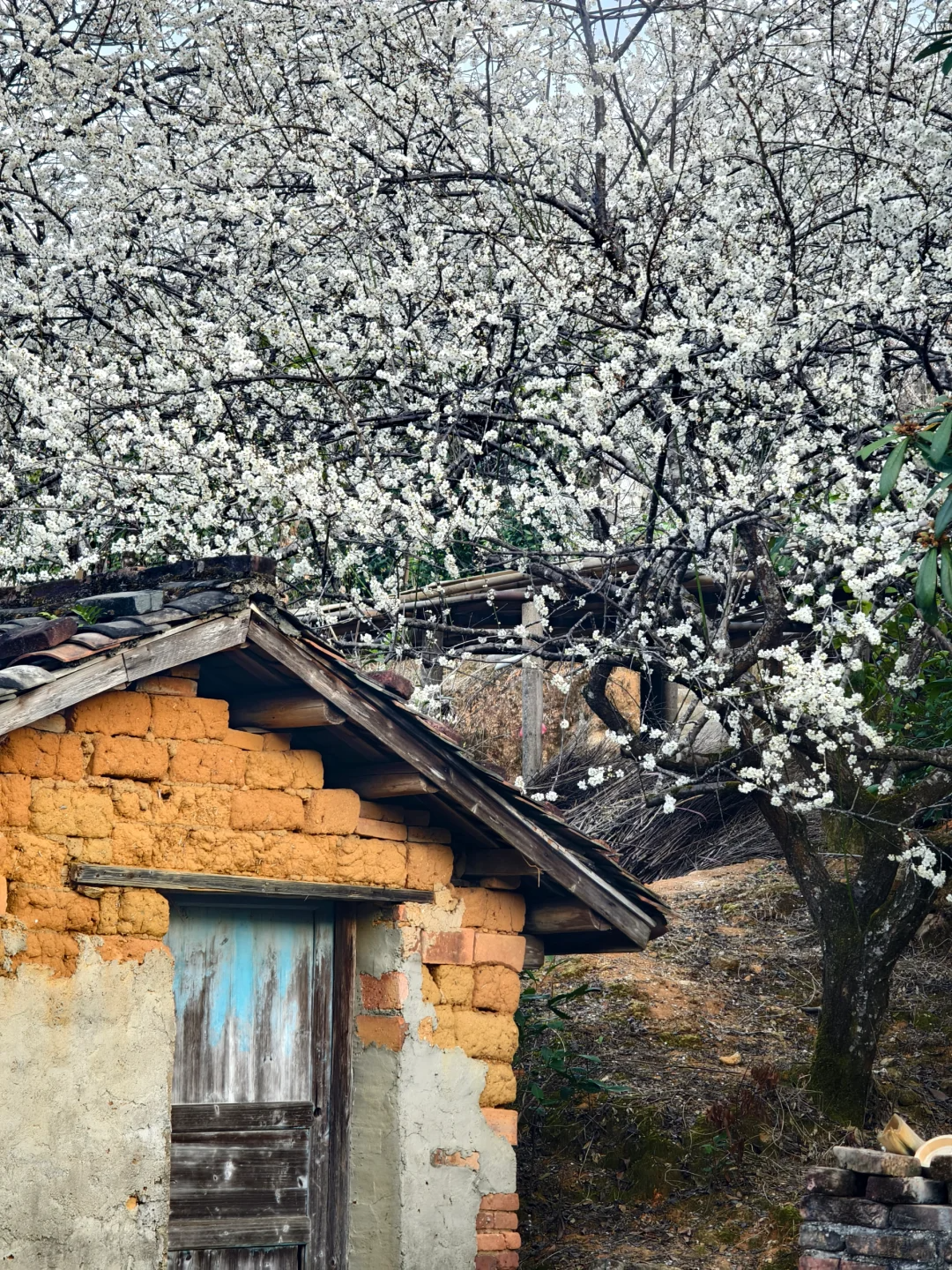 步入林中,可见朵朵白梅缀满枝头,与周边青山绿水相映。