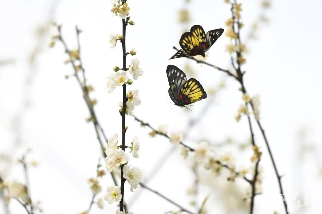 洁白的梅花映着冬阳舒展,嫩黄花蕊引来蜜蜂蝴蝶穿梭。