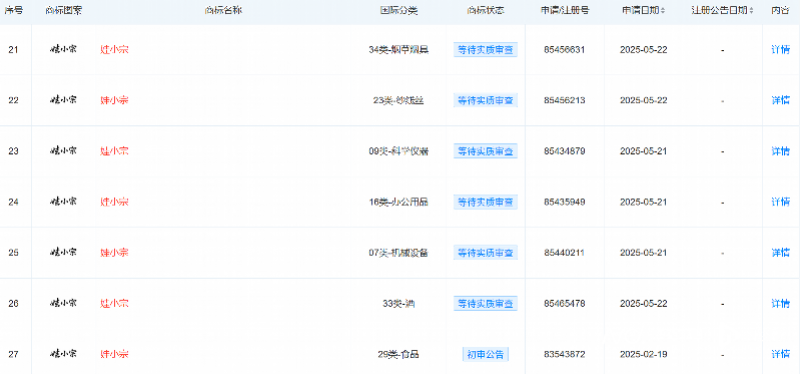 但宏胜集团此前已经注册了“娃小宗”商标,这一事实增加了上述通知的可信度。天眼查数据显示,宏胜饮料集团有限公司已成功注册多个“娃小宗”商标,国际分类包括食品、啤酒饮料等。