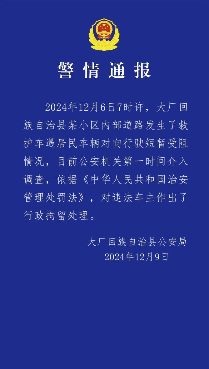00:08 河北大厂警方通报救护车遇阻事件:违法车主被行政拘留河北大厂公安局12月9日通报,12月6日7时许,大厂回族自治县某小区内部道路发生了救护车遇居民车辆对向行驶短暂受阻情况,目前公安机关第一时间介入调查,依据《中华人民共和国治安管理处罚法》,对违法车主作出了行政拘留处理。 编辑 傅倩影 订阅后可查看全文(剩余80%)