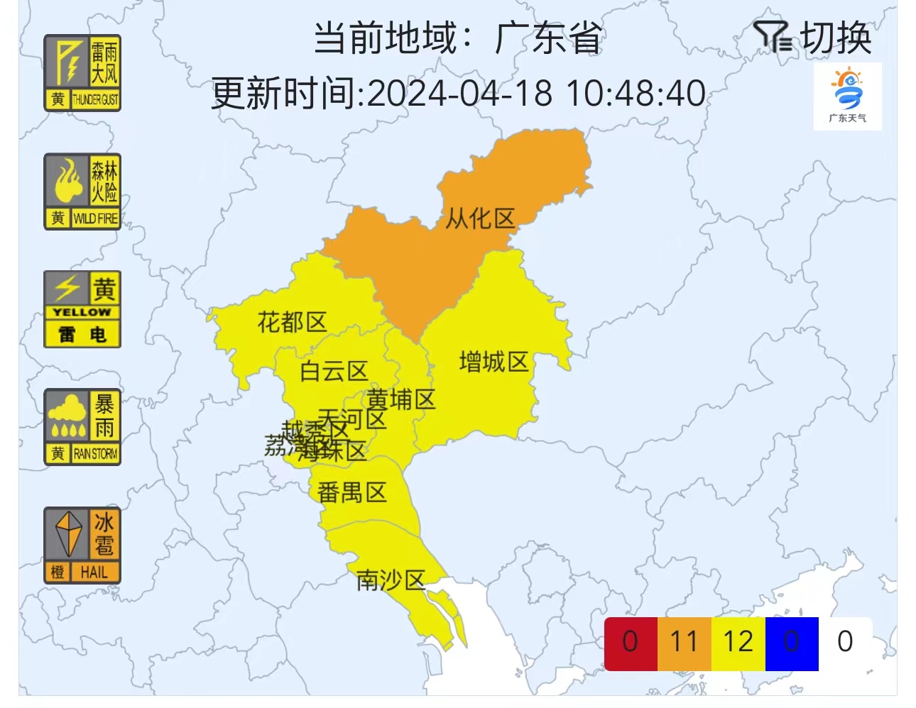 4月18日上午,截至10时48分,广州有11区发布暴雨黄色预警和雷雨大风黄色预警,并出现冰雹预警等预警信号。