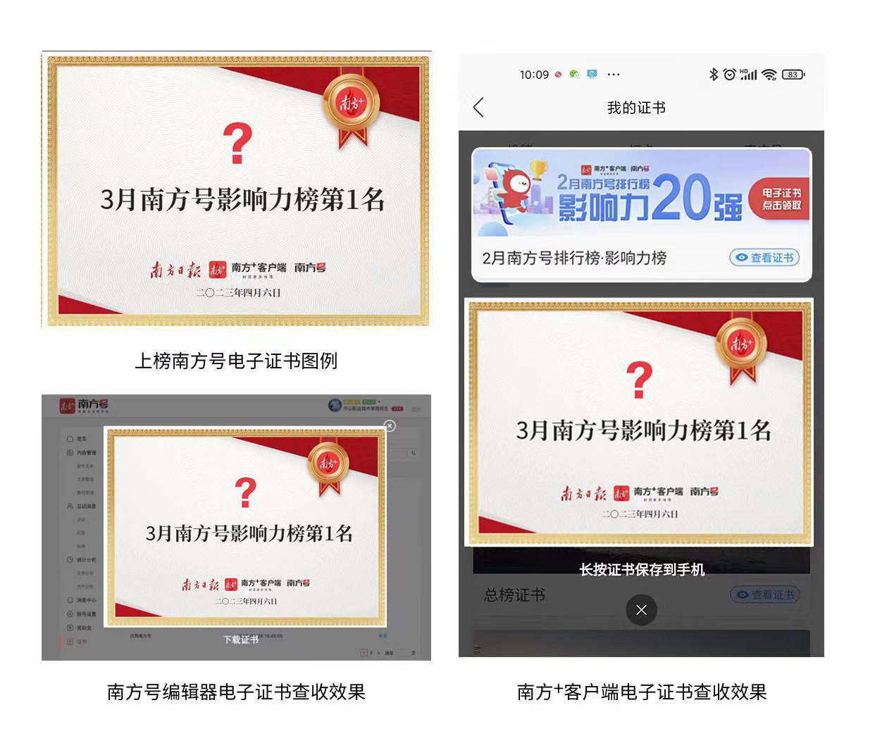 南方号电子证书功能即将上线,每次上榜后,登录南方号编辑器或南方+客户端即可一键下载,珍藏属于你的南方号荣誉!