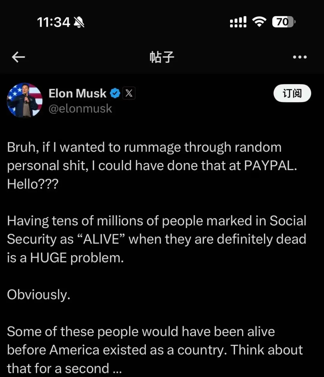 当地时间2月18日,马斯克再次提到此事,称这是一个巨大的问题,“仔细想想,他们中有些人甚至在美国建国之前就已经活着了……”