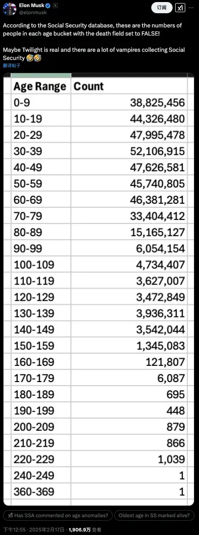 马斯克周一公布了美国社保数据库中,每个年龄段中“是否死亡”字段设置为否的人数。其中存在两个问题:人数对不上和年龄太离谱。