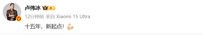 雷军发文后,小米集团众高管纷纷转发表态。小米集团合伙人、总裁、小米品牌总经理卢伟冰:“十五年,新起点!”