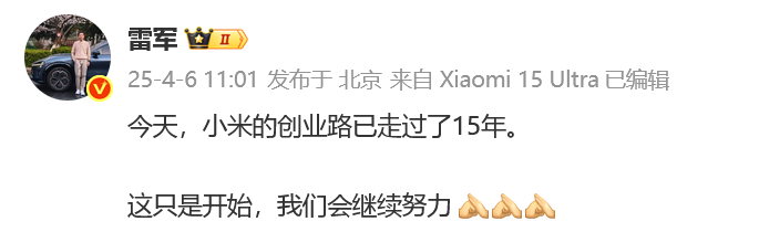 2025年4月6日是小米公司成立15周年纪念日。小米创始人雷军当日在微博发文:“今天,小米的创业路已走过15年。这只是开始,我们会继续努力。”