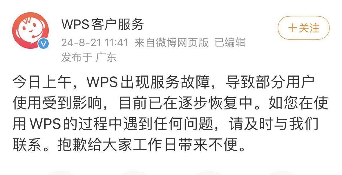 8月21日上午,多名网友在社交平台上反映“WPS崩了”,相关话题登上热搜。同日11时许,WPS客服官方微博发文称,WPS出现服务故障,目前已在逐步恢复中。13时许,WPS客服人员告诉南都记者,目前WPS已恢复服务。
