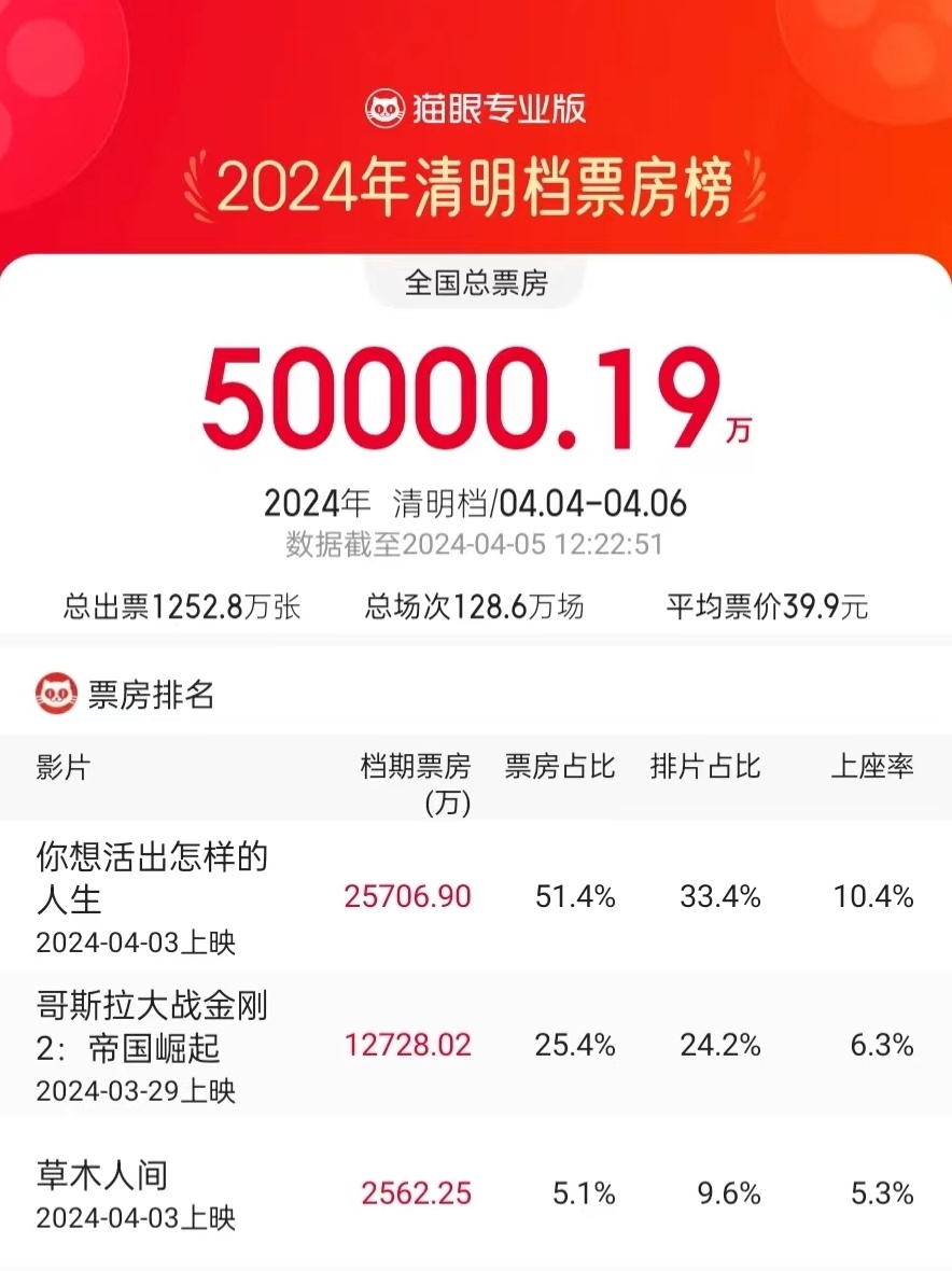 据猫眼专业版数据,4月5日12时22分,2024年清明档(4月4日—4月6日)总票房突破5亿元。《你想活出怎样的人生》《哥斯拉大战金刚2:帝国崛起》《草木人间》分列清明档票房榜前三。