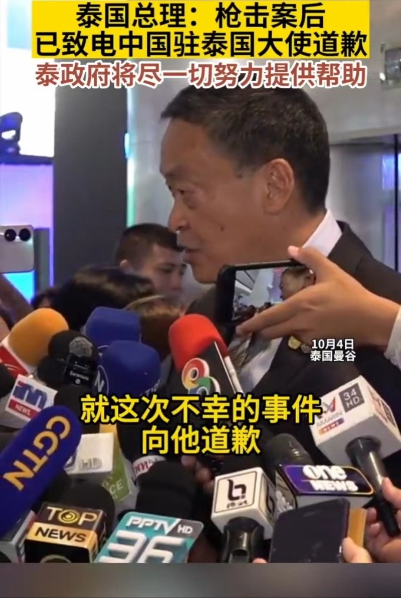 泰国总理赛塔接受媒体采访。同日,泰国总理赛塔就商场枪击案召开新闻发布会,并在回答媒体提问时表示,事件发生后已致电中国驻泰国大使道歉,称将竭尽所能为遇难者和伤者提供一切帮助。