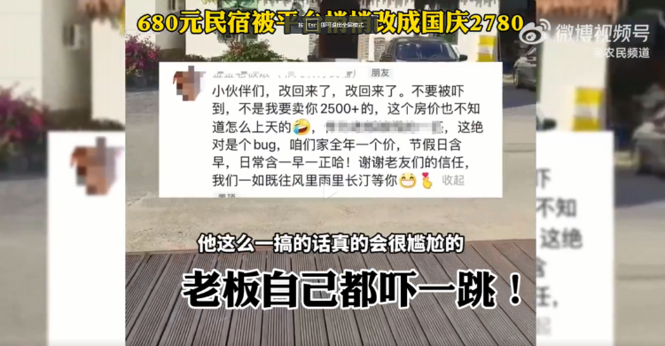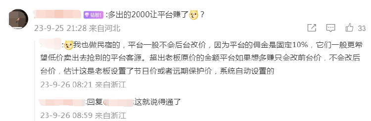 也有网友表示自己就是做民宿的,该网友称,平台一般不会后台改价,因为平台的佣金是固定10%,它们一般更希望低价卖出去抢别的平台客源。超出老板原价的金额平台如果想多赚只会改前台价,不会改后台价,估计这是老板设置了节日价或者远期保护价,系统自动设置的。