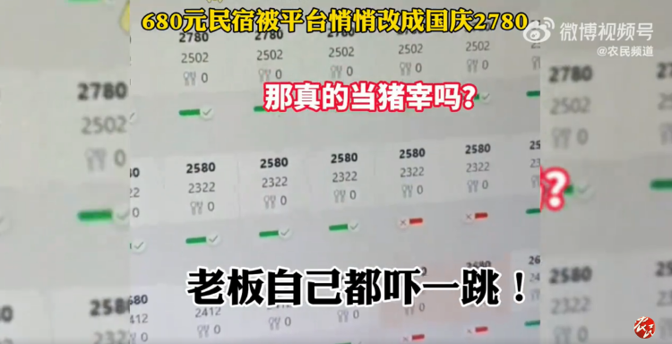 据河北广播电视台农民频道官方微博9月25日消息,近日在浙江丽水,一民宿老板打开某平台自家民宿价格页面后,吓了一跳:原本680元一天的客房,在她不知情的情况下,被平台调整为了国庆特价2780元!之后,该民宿老板回应表示:“已下架,不然别人以为我们宰客!”