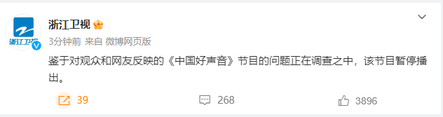今日上午,浙江卫视官方微博发布消息称,鉴于对观众和网友反映的《中国好声音》节目的问题正在调查之中,该节目暂停播出。此前一段李玟生前控诉《中国好声音》节目组的音频传出,事件一再发酵,后续也有不少参加过节目的选手学员及工作人员进行爆料,引发热议。详情>>