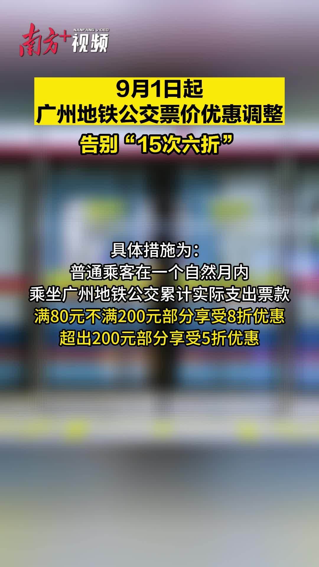 8月25日,广州地铁集团与广州公交集团联合发布了《关于实施<广州市公共交通票价优惠调整方案>的公告》。广州地铁公交票价优惠调整将于2023年9月1日起正式实施,由原来的累次优惠调整为累额优惠,即多乘优惠多,具体措施为:“普通乘客在一个自然月内,乘坐广州地铁公交累计实际支出票款满80元不满200元部分享受8折优惠;超出200元部分享受5折优惠。”详情>>