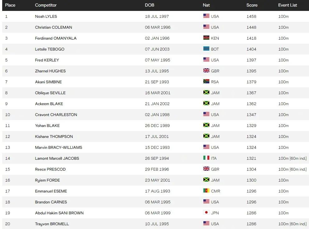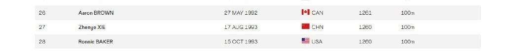 男子百米世界排名中