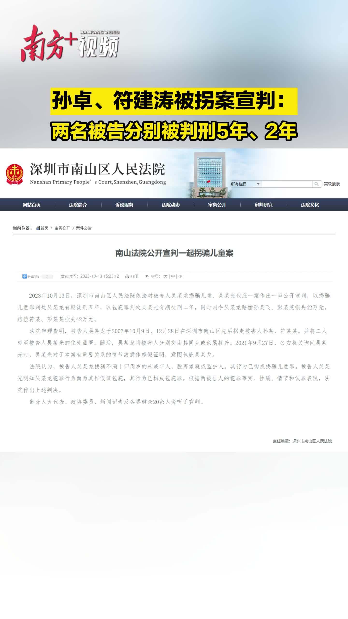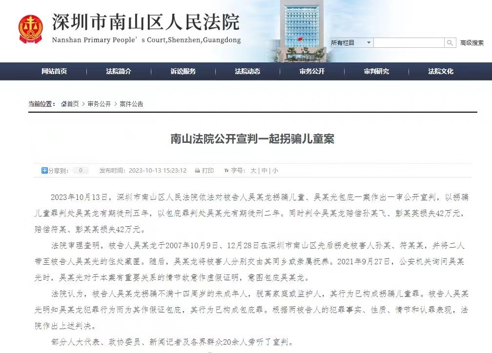 2023年10月13日,深圳市南山区人民法院依法对被告人吴某龙拐骗儿童、吴某光包庇一案作出一审公开宣判,以拐骗儿童罪判处吴某龙有期徒刑五年,以包庇罪判处吴某光有期徒刑二年。同时判令吴某龙赔偿孙某飞、彭某英损失42万元,赔偿符某、彭某某损失42万元。