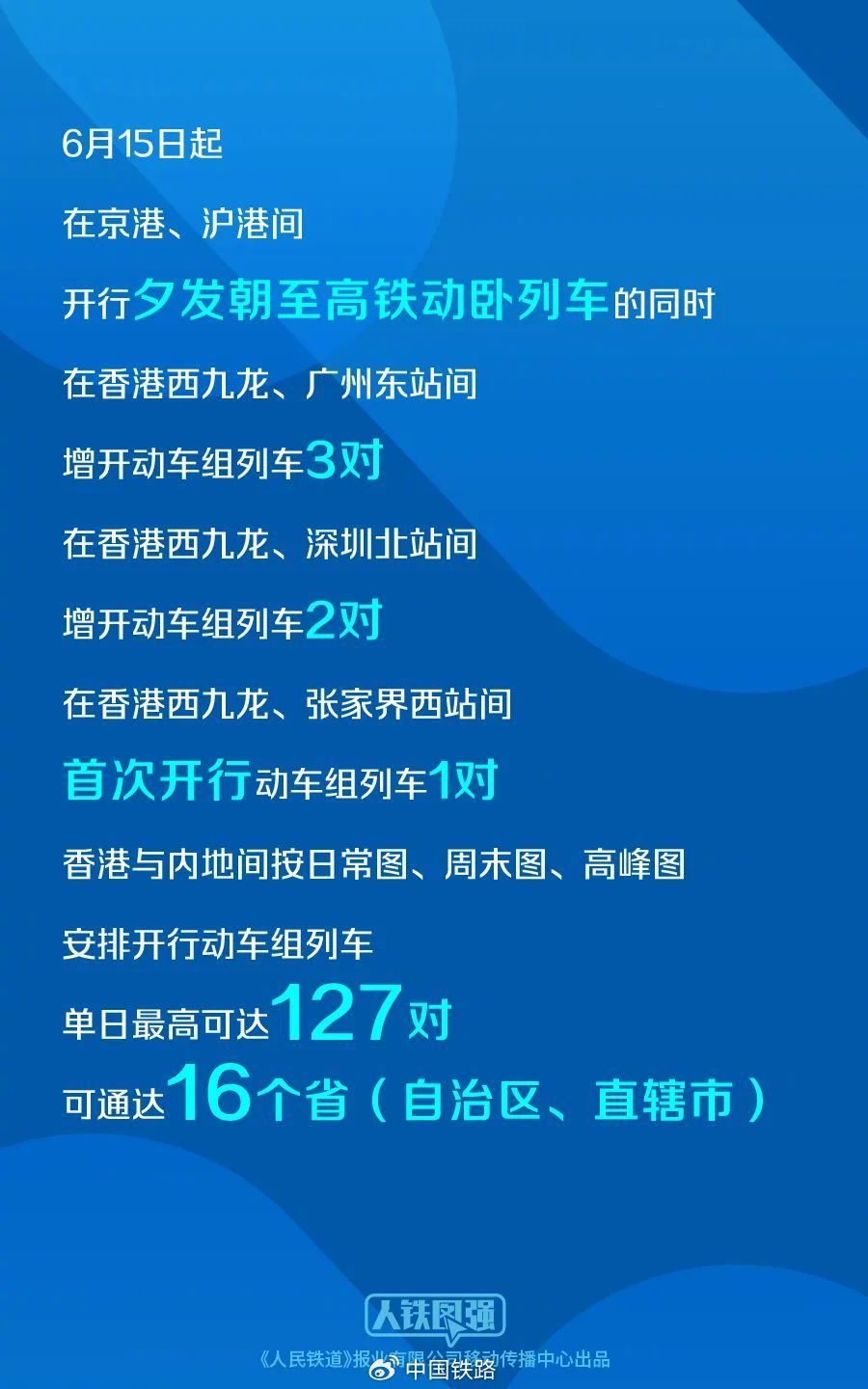 广深港高铁旅客跨境运输恢复以来,国铁集团与香港铁路部门紧密协作,精心组织跨境运输,加大运力投放,持续提升运输服务品质,扩大“灵活行”产品覆盖范围,推出计次票、定期票等新型票制产品,香港与内地间跨境客流保持强劲增长态势,今年1至5月累计发送跨境旅客1074万人次,同比增长79.9%。6月15日起,在京港、沪港间开行夕发朝至高铁动卧列车的同时,在香港西九龙、广州东站间增开动车组列车3对,在香港西九龙、深圳北站间增开动车组列车2对,在香港西九龙、张家界西站间首次开行动车组列车1对,香港与内地间按日常图、周末图、高峰图安排开行动车组列车,单日最高可达127对,可通达16个省(自治区、直辖市)。跨境旅客运输的提质扩能,有利于进一步发挥高铁香港段与全国高铁网互联互通优势,对促进香港与内地间人员、经贸和文化往来,推动香港更好融入国家发展大局,具有重要意义。