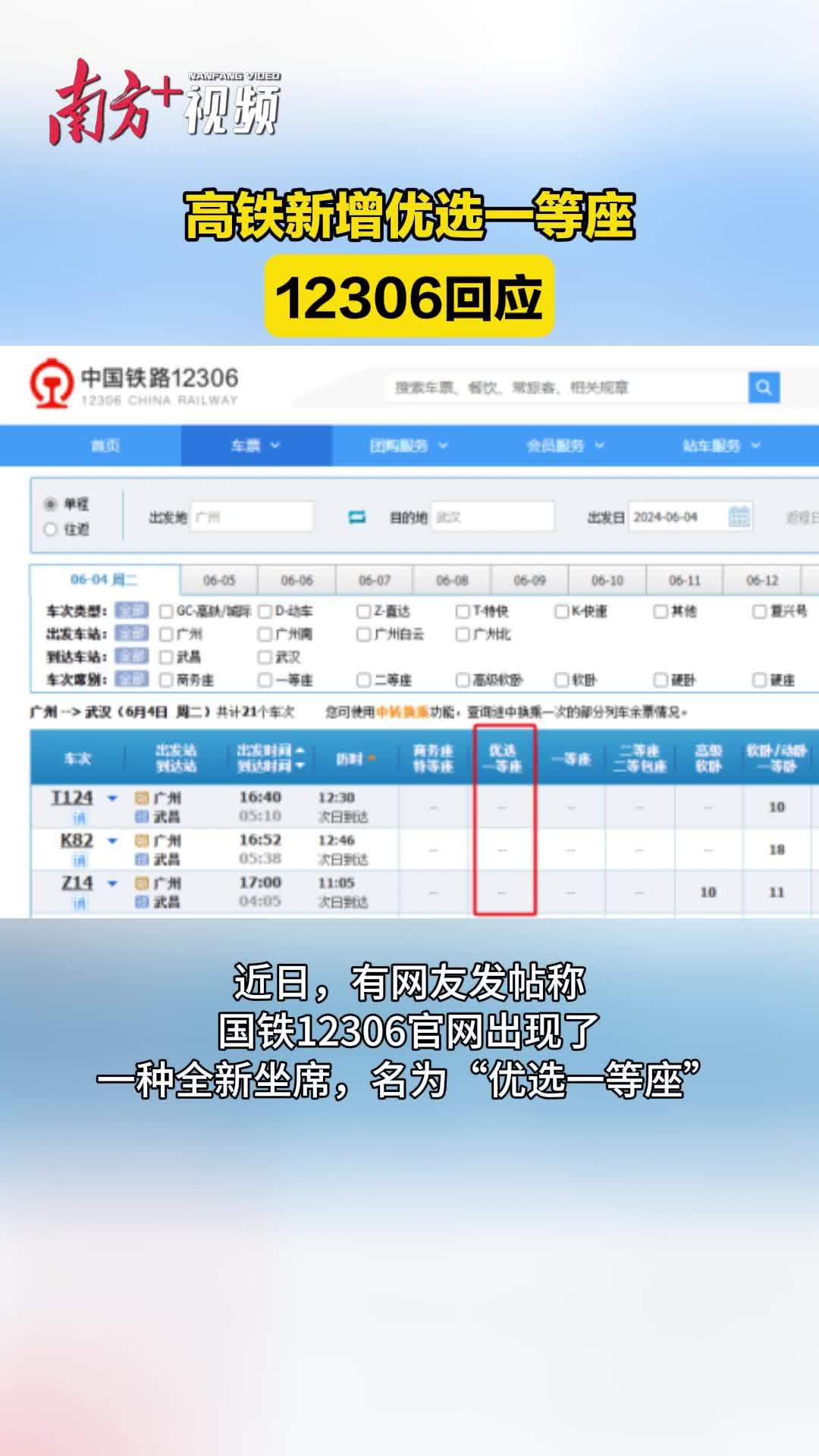 高铁新增“优选一等座”选项。12306客服回应,“优选一等座”并非所有车次都有,目前只有复兴号和智能号会有,票价在商务座和一等座之间。详情>>