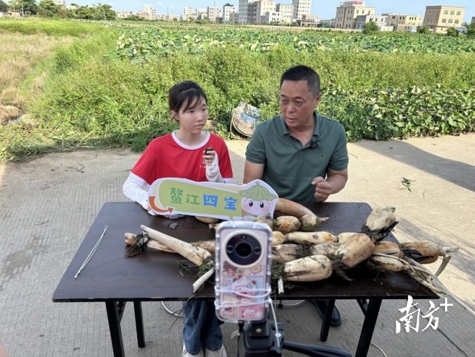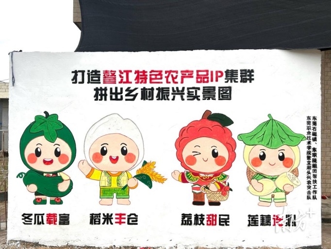 在东莞石碣镇、东职院组团驻鳌江镇帮镇扶村工作队(下称“帮扶工作队”)的支持下,东职院实践团队紧密对接地方需求。其中“鳌立潮头”兴农突击队在帮扶工作队指导下,以“文化赋能产业,青春助力振兴”为主题,立足鳌江资源禀赋,创新提炼“鳌江四宝”(冬瓜、莲藕、荔枝、大米),精心设计融合嵌瓷、揭阳青狮、潮剧、惠来渔歌等非遗元素的IP形象。通过文创开发、电商直播、艺术墙绘等东职院特色实践,团队成功探索“IP+文创+电商+文旅”融合模式。
