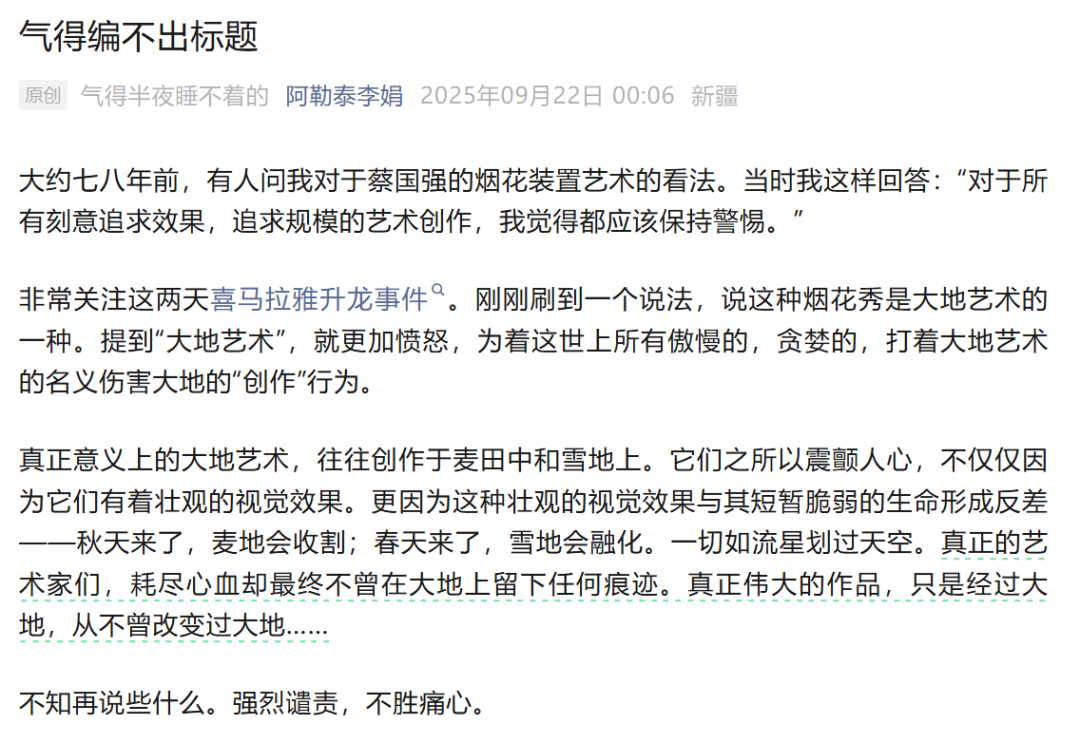 9月22日凌晨,作家李娟发文谴责喜马拉雅“升龙”烟花事件: