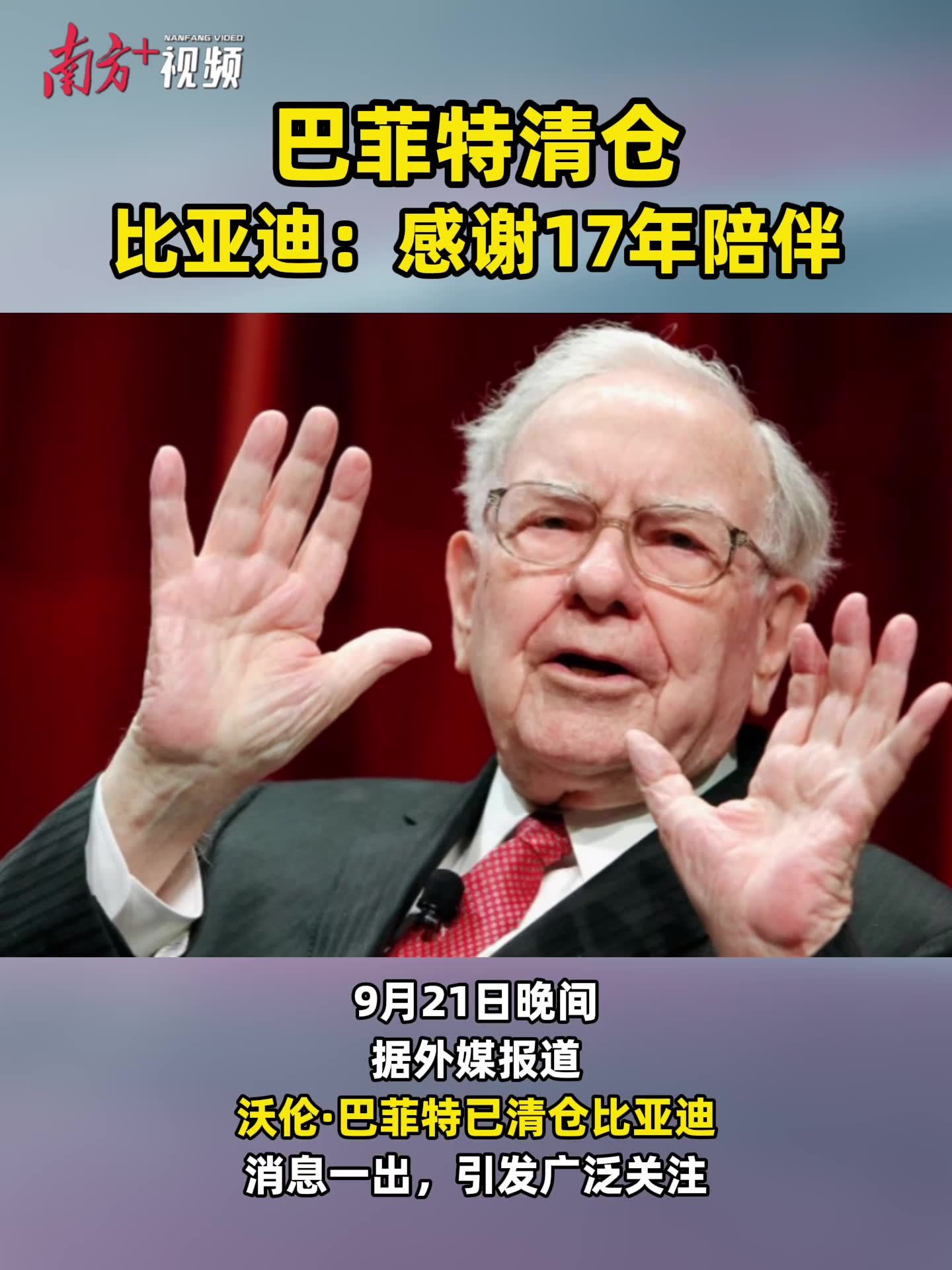 9月21日晚间,据外媒报道,沃伦·巴菲特旗下的伯克希尔·哈撒韦已完全退出其在比亚迪的投资。消息一出,引发广泛关注。对此比亚迪公关负责人回应,“感谢芒格和巴菲特对比亚迪的认可,也感谢过去17年的投资、帮助和陪伴!”
