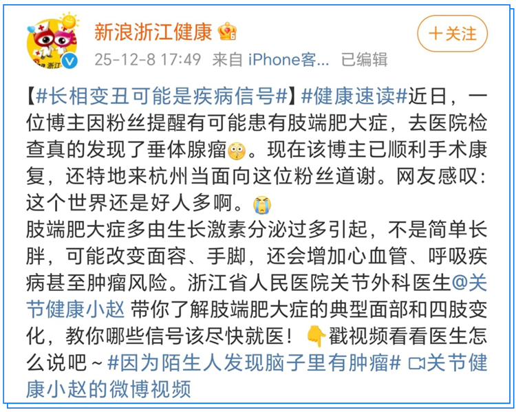 一位面容有异常的博主,在网友的善意提醒下去做检查,结果发现了垂体腺瘤(一种常见的颅内肿瘤)。万幸的是,因发现及时,手术很成功,她平安回家了。