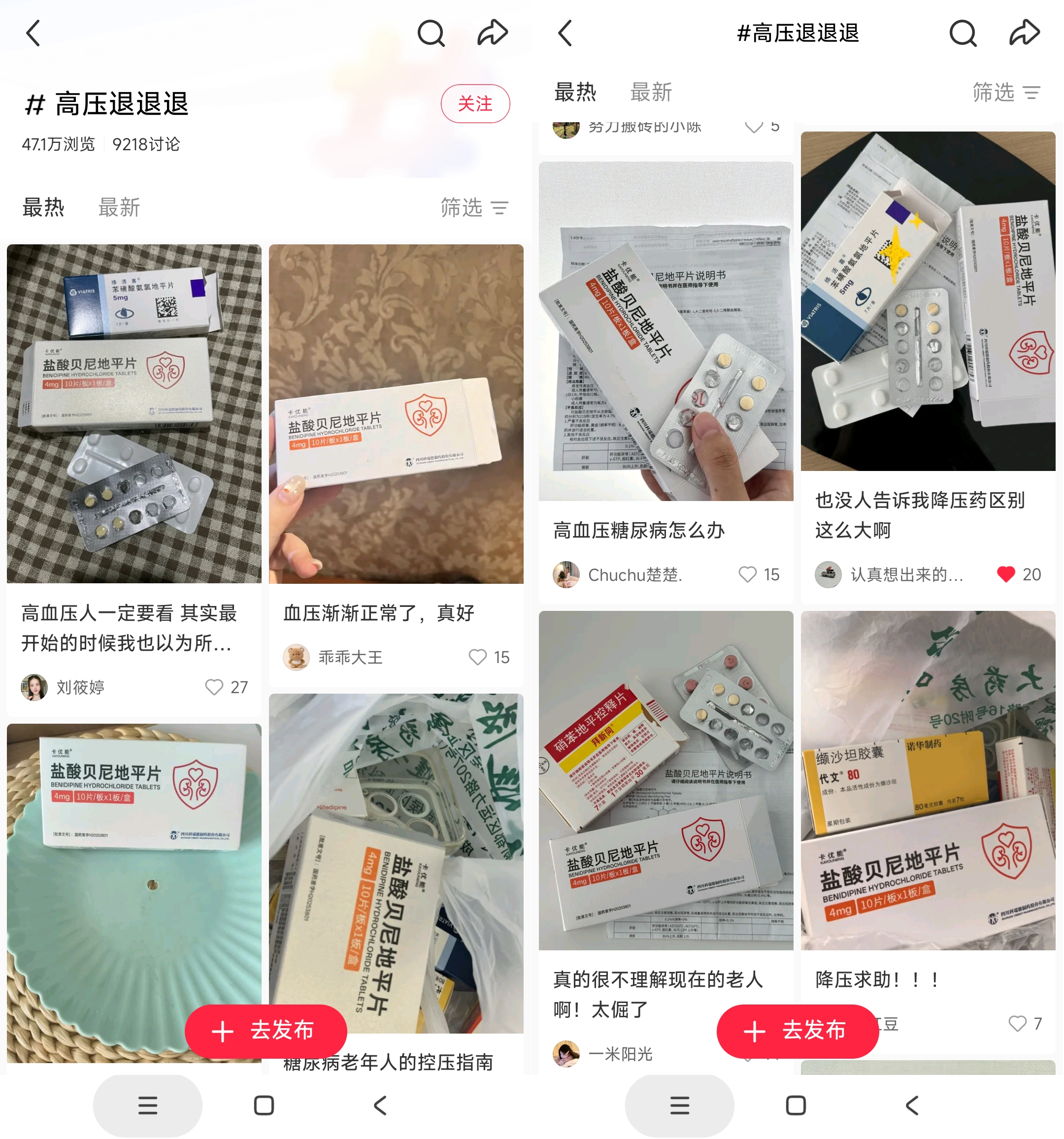 “坚持吃了三天,起床之后的血压从147/80已经回到125/78了。”“也没人告诉我降压药区别这么大啊。”……同时,多配有不同血压药放在一起的图片,以及血压仪示数等。